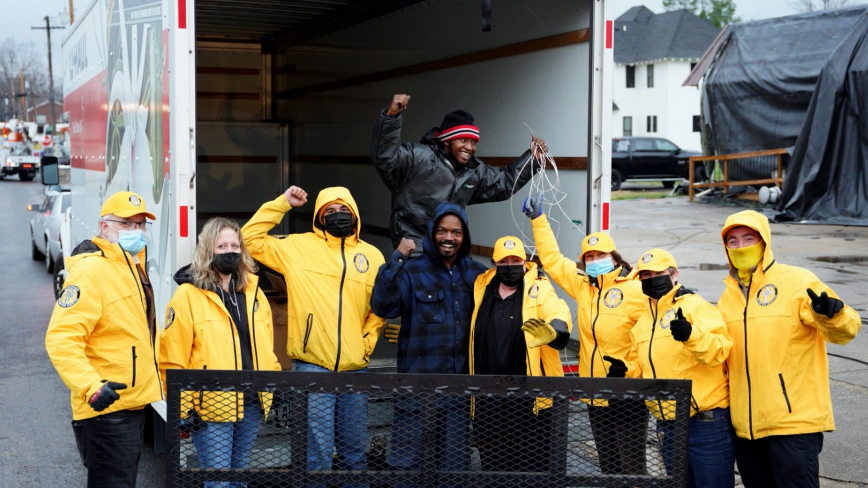 Un camión lleno con 100 generadores, radiadores y bombonas de propano se acercó a la carpa amarilla en la esquina de la 8th y Walnut en Mayfield, Kentucky. Los Ministros Voluntarios ayudaron a descargar el valioso contenido del camión, todo encontró hogar ese mismo día junto con 2900 comidas calientes que los voluntarios repartieron.