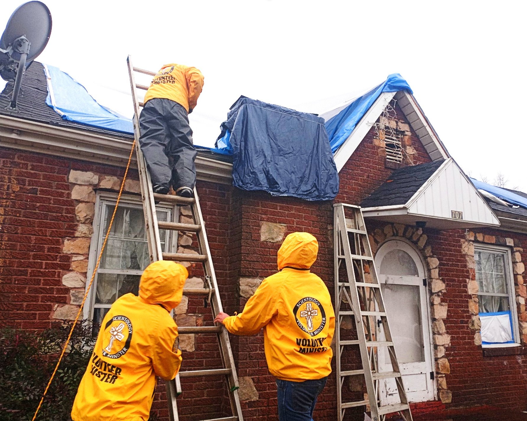 A petición de un pastor cuya iglesia había sido destruida por el tornado, los Ministros Voluntarios despejaron el patio alrededor de la iglesia para que se pudieran poner carpas para los feligreses que necesitaban albergue. Y siempre que para de llover los voluntarios se apresuran a poner lonas en los tejados de las casas que están dañadas pero no destruidas.