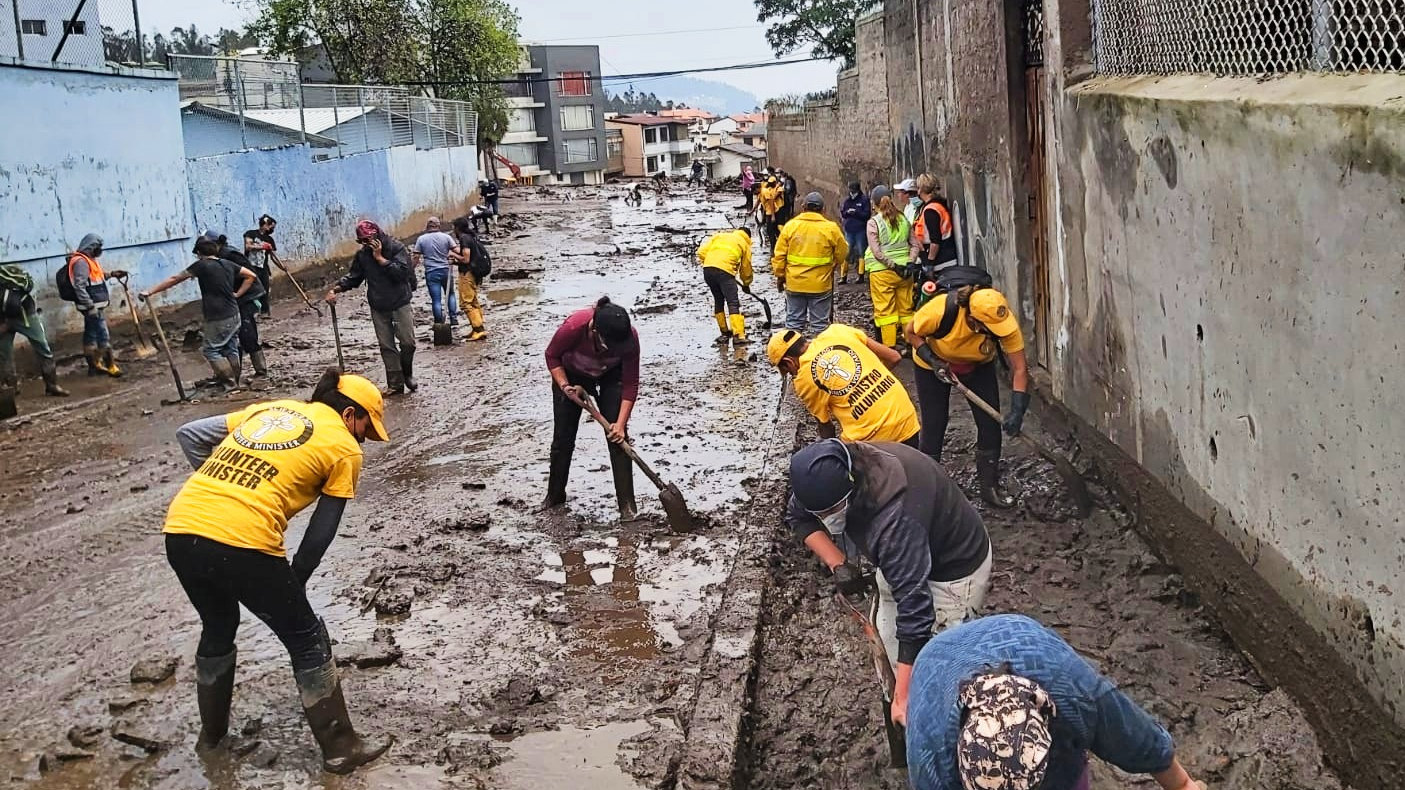 Los Ministros Voluntarios de Scientology de Ecuador trabajan con trabajadores de rescate y equipos de limpieza para ayudar a la ciudad a recuperarse.